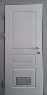 Металлическая дверь с вентиляцией, серыми панелями МДФ (для котельной) КД-1364